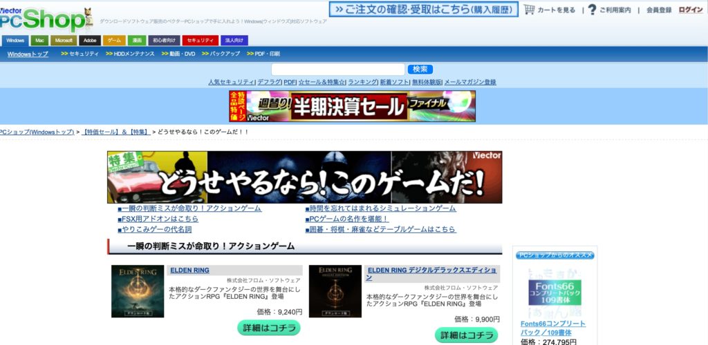 アクション、シミュレーション、囲碁・将棋・麻雀など様々なPCゲームが揃っていますよ。