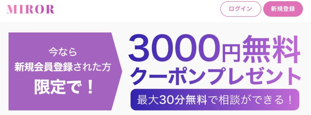 | 特典 | 初回最大30分(3000円分)無料 |