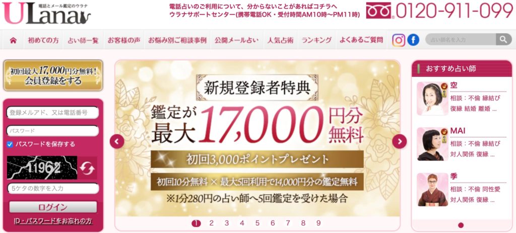 | 特典 | 3,000ポイント、最大5回まで初回10分無料鑑定 |