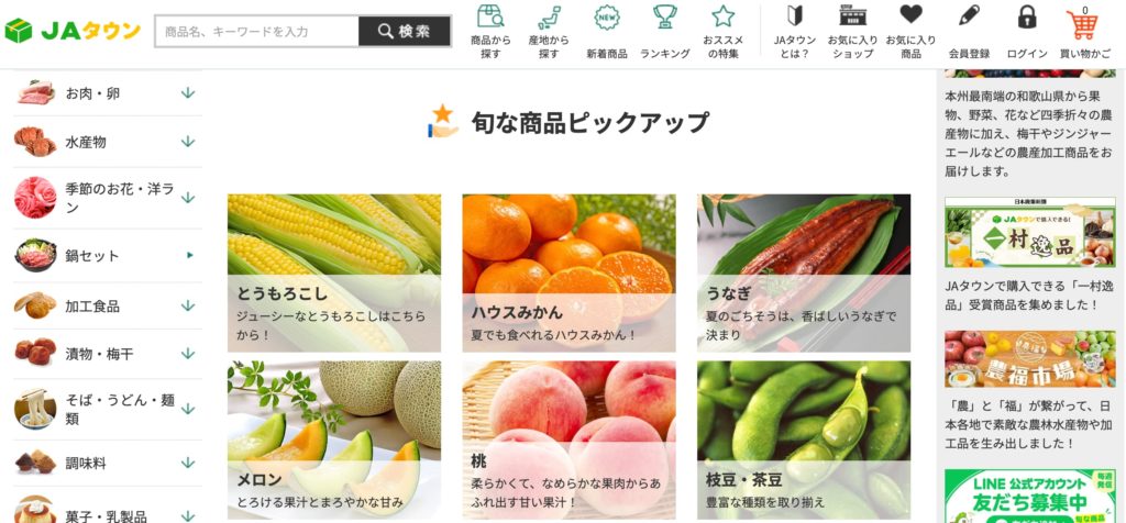 野菜や果物、お肉、魚などの生鮮食品やレトルト食品、冷凍食品、ご当地グルメ、高級グルメなど品揃えも豊富。