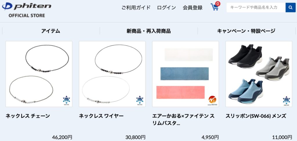 磁気ネックレスやサポーター、スポーツウェアなどもあり、運動のパフォーマンス向上を目指す方におすすめ。
